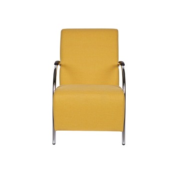- Polyester stoffering in de kleur okergeel, verchroomd metalen frame en kunststof armlegger