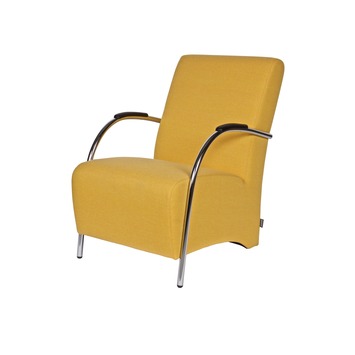 De WOOOD fauteuil Halifax heeft een fijne comfortabele zit. De fauteuil Halifax is gestoffeerd met een stevige stoere polyester stof in de kleur geel gecombineerd met verchroomd metalen armleggers. Op de armleggers zitten zwarte kunststof armleuningen. De afmetingen van Halifax zijn (bxhxd): 85x90x56 cm en de zithoogte is 40 cm. De fauteuil is helemaal van de tijd van nu. De fauteuil Halifax is ook in de kleur zwart, rood en petrol (donkerblauw) verkrijgbaar.