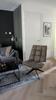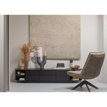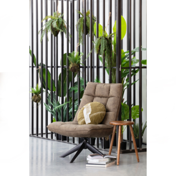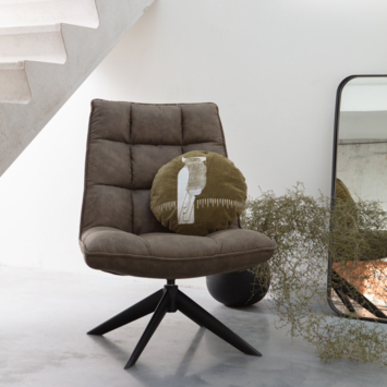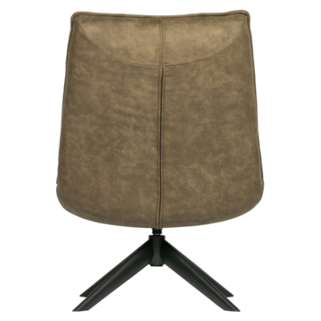 De bekleding is uitgevoerd in PU-leer (100% polyester). Dit materiaal heeft de luxe uitstraling van echt leer, maar is onderhoudsvriendelijk, kleurvast en slijtvast. De leerlook voelt zacht aan en ontwikkelt na verloop van tijd een natuurlijke structuur, waardoor de fauteuil alleen maar meer karakter krijgt. Het zwarte metalen onderstel met poedercoating maakt de stoere look compleet.