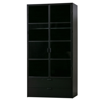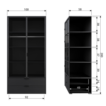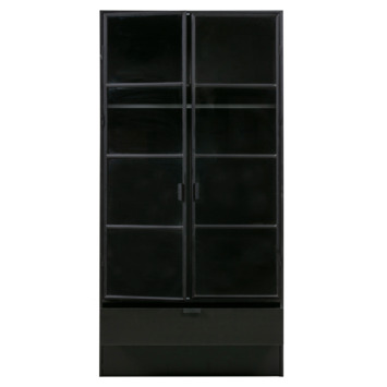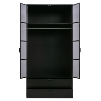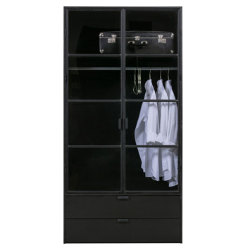 Deze stoere, eigentijdse Sivan garderobekast is een eigen ontwerp uit de collectie van het Nederlandse merk WOOOD. Sivan is een hangkast die gemaakt is van massief geschuurd grenen (FSC) in een zwarte finish. De deuren zijn gemaakt van zwart metaal en zijn voorzien van safety rookglas met een grijze tint. Leuk om je mooiste kleding te etaleren!