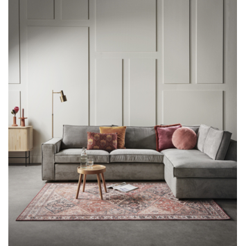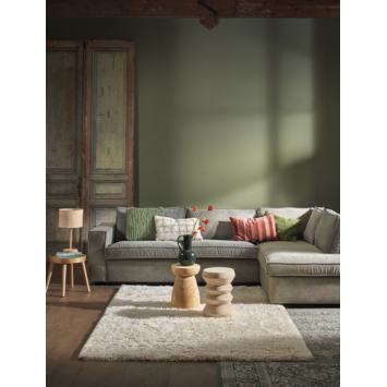 De WOOOD hoekbank Thomas vergrijsd groen ribstof polyester met verlenging rechts is een royale bank die plaats biedt aan het hele gezin. Dankzij de ruime zitdiepte van 60 cm kun je zowel rechtop comfortabel zitten als heerlijk languit liggen. De naar buiten gestikte naden in combinatie met de kunststof ronde poten geven de bank een stoere uitstraling. De warme en basic look maakt dat de Thomas moeiteloos in uiteenlopende woonstijlen past.