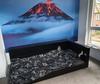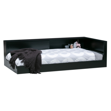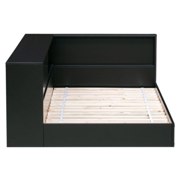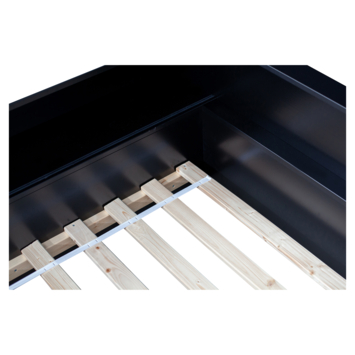 Stoer hoekbed. Massief grenenhout met een zwarte afwerking. Mét opbergruimte.