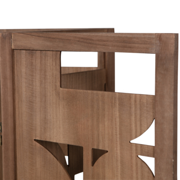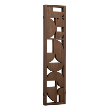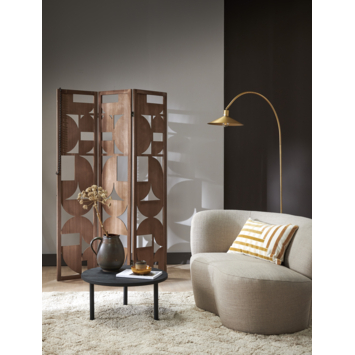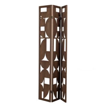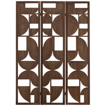 Kamerscherm Alana komt uit de collectie van het Nederlandse interieurmerk WOOOD en biedt een stijlvolle oplossing om de woonruimte subtiel te verdelen of af te schermen. Het kamerscherm is gemaakt van MDF met een walnootkleurige afwerking. Het grafische patroon in de drie panelen zorgen voor een mooi diepte-effect en bieden redelijk wat privacy.