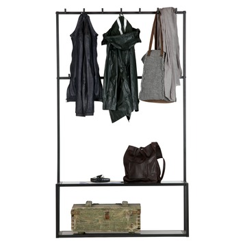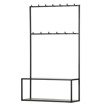 Met de zwart gelakte metalen kapstok Teun, afmetingen (bxhxd): 100x172x35 cm, heb je een trendy en eigentijdse kapstok in je gang en/of hal. De kapstok Teun, van het merk WOOOD, is gemaakt van een metalen buisframe 20x20 mm, zwart gelakt, gecombineerd met een zwart gelakte MDF legplank. Op de bovenste rij heb je 6 kledinghaken en op de rij er onder 7 kledinghaken. De MDF legplank kan bijvoorbeeld gebruikt worden als schoenen plank en is geplaatst op 40,5 cm hoogte van de onderzijde van het rek.