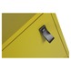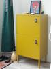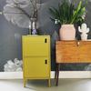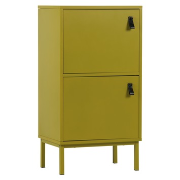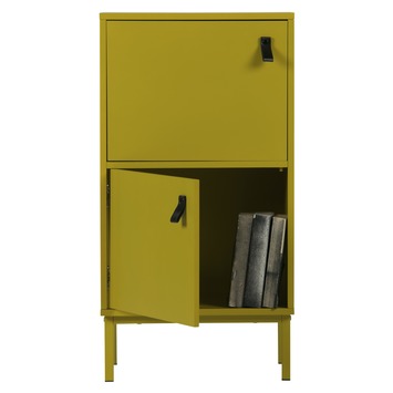 Het 15 cm hoge metalen onderstel van kast Nico is in dezelfde mosterd kleur als de kast zelf gespoten, wat de kast een heel trendy uitstraling geeft.