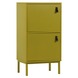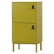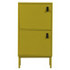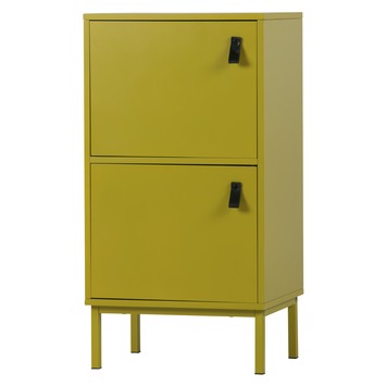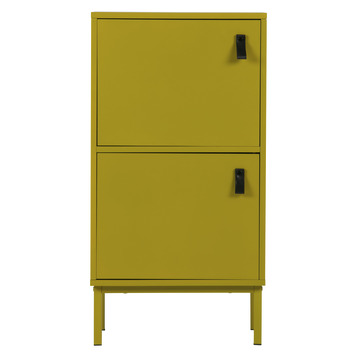 Het WOOOD kastje Nico (hxbxd) 85x45x35 cm is een tweedeurs kast van MDF gelakt in mosterd. De twee deurtjes (hxb) 32,5x41,5 cm openen met echt lederen lussen.