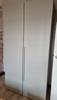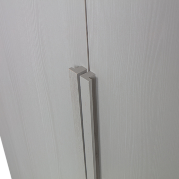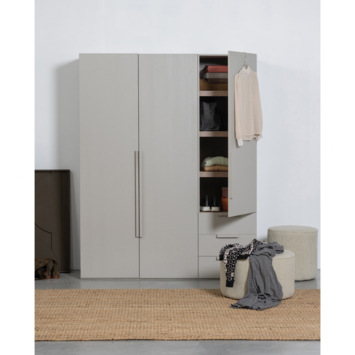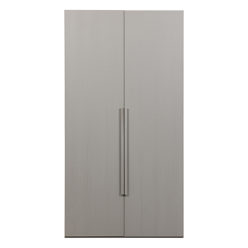 De kast is gemaakt van sterk hout en uitgevoerd in een matte lichtgrijze afwerking. De deuren lopen over de volledige hoogte van de kast en geven het meubel een rustige en eigentijdse uitstraling. Het houtwerk van 1,5 cm dikte benadrukt de kwaliteit en stevigheid.