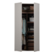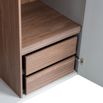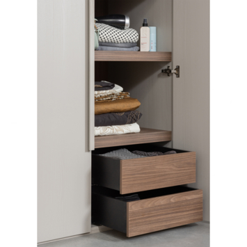 Achter de twee deuren vind je een ruim ophanggedeelte en vier opbergvakken. De vier vakken hebben een afmeting van 37 x 53 x 55 cm, terwijl het bovenste vak de volledige breedte van 107 cm beslaat. Daarnaast zijn er twee lades met rolgeleiders, elk 13 x 48 x 48 cm groot. Het hanggedeelte is 155 cm hoog en 53 cm breed, ideaal voor langere kledingstukken.