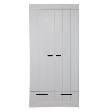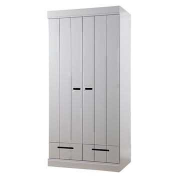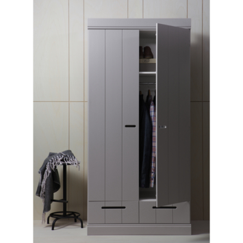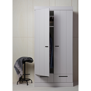 Uit de serie CONNECT van WOOOD is deze stoere basic kledingkast (hxbxd) 195x94x53 cm, in de kleur grijs. Bij deze kledingkast zijn een strakke sokkel en koof gecombineerd met strokendeuren met sleuven en 2 lades standaard voorzien van stevige, metalen ladegeleiders. Met de CONNECT kasten kun je je eigen kastenwand bouwen! In de hal, slaap- of kinderkamer: CONNECT is een fijne opberger en past in iedere ruimte! Als losse kast of als meerdere kasten aan elkaar gekoppeld. De romp van de CONNECT kast is gemaakt van massief grenenhout. De binnenzijde is voorzien van een spaanplaat en melamine interieur, wat erg praktisch is met schoonmaken.