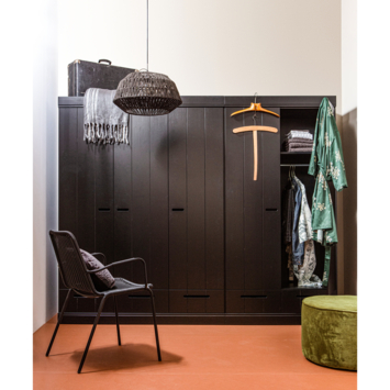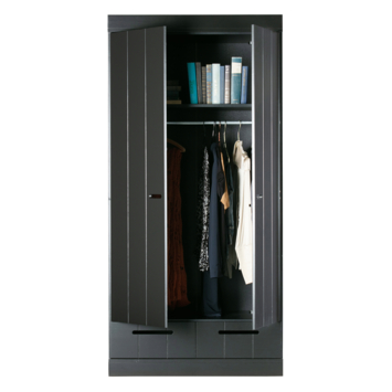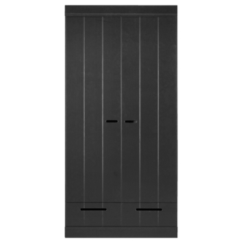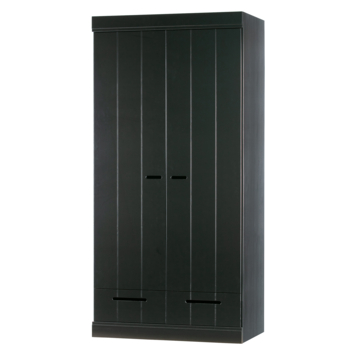 Uit de serie CONNECT van WOOOD is deze stoere basic kledingkast (hxbxd) 195x94x53 cm. Deze kledingkast is in de kleur zwart gespoten, maar je schildert de kast in een handomdraai in een andere kleur als dat beter in je interieur past. Bij deze kast zijn een strakke sokkel en koof gecombineerd met strokendeuren met sleuven en 2 lades standaard voorzien van stevige, metalen ladegeleiders. Met de CONNECT kasten kun je je eigen kastenwand bouwen! In de hal, slaap- of kinderkamer: CONNECT is een fijne opberger en past in iedere ruimte! Als losse kast of als meerdere kasten aan elkaar gekoppeld. De romp van de CONNECT kast is gemaakt van massief grenenhout. De binnenzijde is voorzien van een spaanplaat en melamine interieur, wat erg praktisch is met schoonmaken.