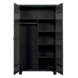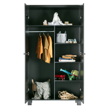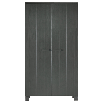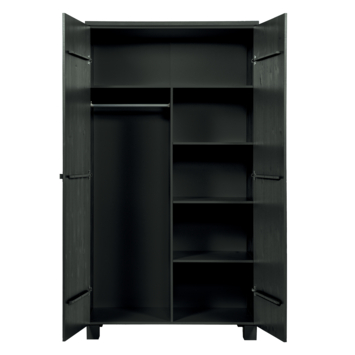 Dennis is een stoere, praktische en moderne kledingkast uit de collectie van het Nederlandse merk WOOOD. De kledingkast is vervaardigd uit geborsteld grenenhout en heeft een stoere zwarte finish gekregen. Het interieur van de kast is van melanine en bestaat uit één brede legplank bovenin en daaronder links een gedeelde roede en rechts drie gedeelde legplanken. Door de robuuste afwerking met een stoere zwarte finish is deze Dennis kast prima geschikt voor meerdere interieurstijlen.