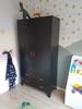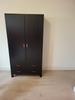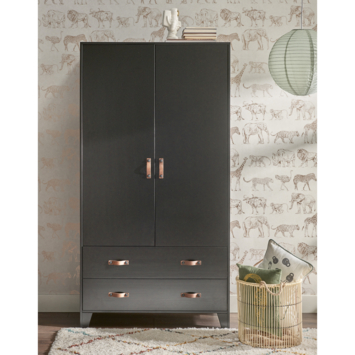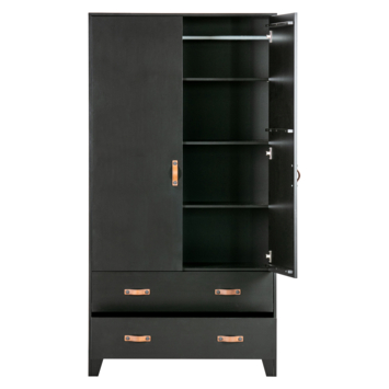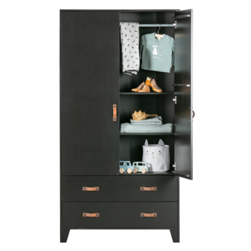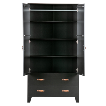 De kast beschikt over twee deuren en twee lades, voorzien van metalen grepen. Daarmee biedt hij praktische opbergruimte voor zowel hangende als gevouwen kleding.