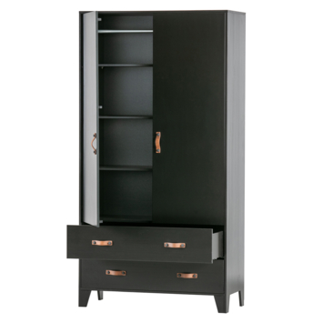 De Dian kast is gemaakt van FSC-gecertificeerd grenenhout en afgewerkt in een diepe zwarte tint. De metalen grepen op de deuren en lades zorgen voor een stoer accent. Door het tijdloze ontwerp combineer je deze kast eenvoudig met andere meubels in de slaapkamer.