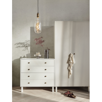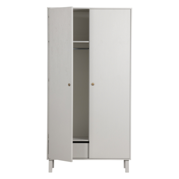 Achter de twee deuren vind je vier legplanken, een royaal hanggedeelte en een brede lade. Zo kun je zowel kledingstukken ophangen als opgevouwen kleding en accessoires overzichtelijk bewaren. Het hanggedeelte en de halve legplanken zijn 79 cm breed, zodat je er gemakkelijk meerdere kledingstukken kwijt kunt.
