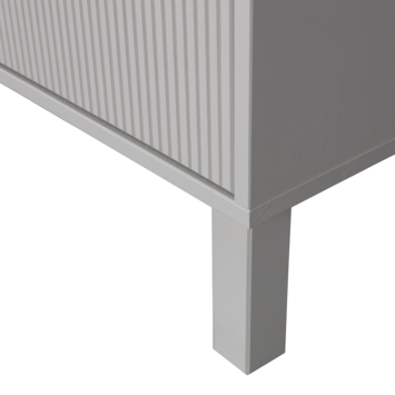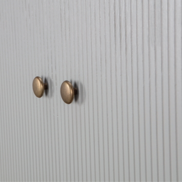 De kast is gemaakt van massief grenenhout en afgewerkt in een wolkengrijze tint. Deze afwerking geeft het meubel een tijdloos karakter. De goudkleurige knoppen zorgen voor een opvallend detail dat de kast een moderne twist geeft.