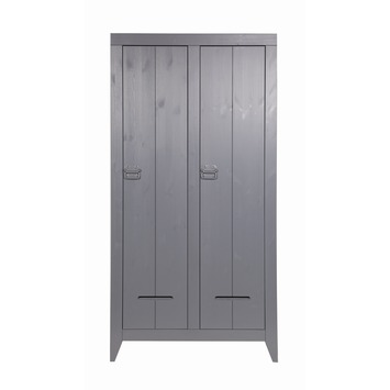 De WOOOD wandkast Kluis, afmetingen (hxbxd) 190x95x44 cm, zit vol legplanken en heeft twee deuren met stoere metalen grepen en solide metalen scharnieren. Deze opberger uit de collectie van WOOOD, is gemaakt van massief grenen, gelakt in de kleur staalgrijs en heeft een geborstelde afwerking. Bij het borstelen van grenen meubelen wordt de nerf sterk geaccentueerd en ontstaat een doorleefd oppervlak. De kast is voorzien van 4 gemelamineerde spaanplaat legplanken (dus 5 opbergvakken) achter elke deur en past in elke ruimte: de kinderkamer, de woonkamer en/of de studeerkamer.