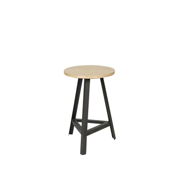 - Metalen driehoek onderstel en ronde houten zitting