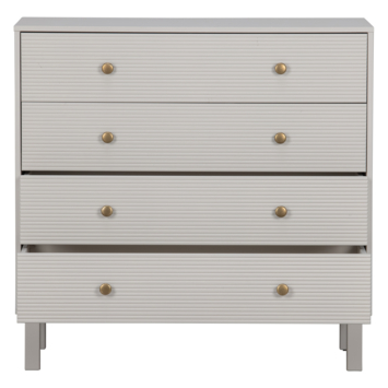 De ladekast biedt veel opbergruimte dankzij de vier royale lades. Elke lade heeft een afmeting van 86 cm lang, 38 cm breed en 20 cm hoog. Daarmee is er voldoende plek om kleding, linnengoed of andere spullen overzichtelijk op te bergen. De totale afmetingen van de kast zijn 91 cm hoog, 94 cm breed en 52 cm diep, waardoor het een praktisch formaat heeft voor in de slaapkamer of woonkamer.