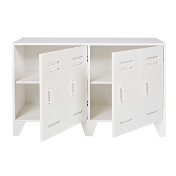 De WOOOD lockerkast Stijn (hxbxd) 65x103x40 cm is een 2-deurs kast met solide metalen scharnieren in de kleur wit is gemaakt van massief, FSC gecertificeerd, grenenhout. Beide deuren van de kast hebben een verticale V-groef lijn en 4 metalen grepen. Deze accenten geven de dressoir lockerkast Stijn een stoere en landelijke uitstraling! De dressoir lockerkast Stijn past in iedere ruimte! Achter zowel de rechter- als de linker deur van de kast is gevuld met 2 gemelamineerde legplanken. De lockerkast Stijn is ook in de kleur staalgrijs en in een 2-deurs hoge kast uitvoering verkrijgbaar.