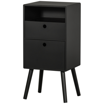 Ozzy is voorzien van een gladde laklaag die het oppervlak beschermt en het meubel een rustige, matte uitstraling geeft. De verticale vorm maakt optimaal gebruik van de beschikbare ruimte, terwijl de combinatie van twee lades en een open vak zorgt voor een overzichtelijke indeling van je persoonlijke spullen. De afgeronde poten geven het ontwerp een luchtige touch en zorgen voor een stabiele basis.