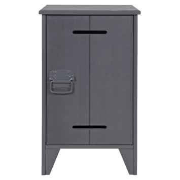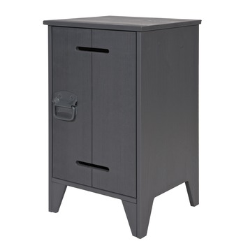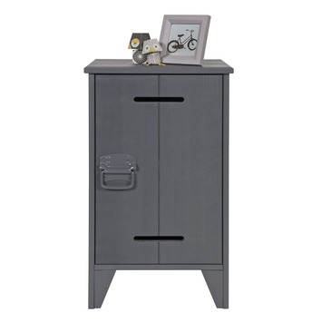 Het WOOOD nachtkastje Kluis, afmetingen (hxbxd) 64x37x35 cm, in de kleur staalgrijs, is een stoere kluis/locker kastje met deurtje, voorzien van een robuuste metalen greep en solide metalen scharnieren. Het deurtje is zowel links- als rechtsdraaiend te monteren. Deze opberger is gemaakt van massief grenen, gelakt in de kleur staalgrijs en heeft een geborstelde afwerking. Bij het borstelen van grenen wordt de houtnerf sterk geaccentueerd en ontstaat er een doorleefd oppervlak. Het kastje is voorzien van 1 spaanplaat legplank die met folie is bekleed en past in elke ruimte, de kinderkamer, de woonkamer en/of de studeerkamer.