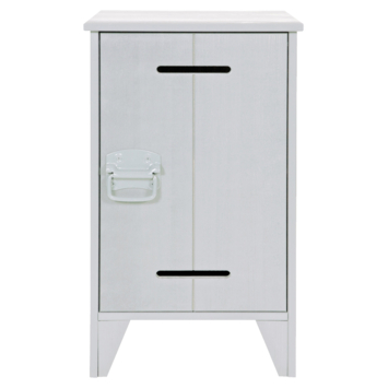 Het WOOOD nachtkastje Kluis, afmetingen (hxbxd) 64x37x35 cm, in de kleur betongrijs, is een stoere kluis/locker kastje met deurtje, voorzien van een robuuste metalen greep en solide metalen scharnieren. Het deurtje is zowel links- als rechtsdraaiend te monteren. Deze opberger is gemaakt van massief grenen, gelakt in de kleur betongrijs en heeft een geborstelde afwerking. Bij het borstelen van grenen wordt de houtnerf sterk geaccentueerd en ontstaat er een doorleefd oppervlak. Het kastje is voorzien van 1 spaanplaat legplank die met folie is bekleed en past in elke ruimte, de kinderkamer, de woonkamer en/of de studeerkamer. Het nachtkastje Kluis is ook in de kleur staalgrijs gelakt verkrijgbaar.