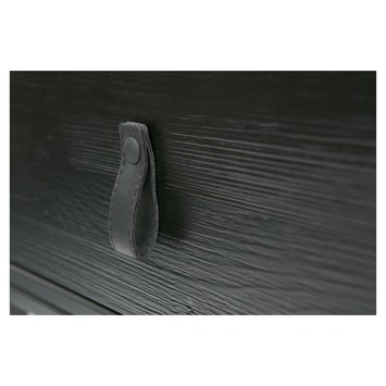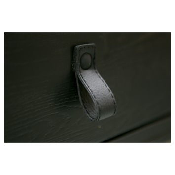 Mooi detail met leren lus. Helaas te weinig schroeven aanwezig om kastje in elkaar te zetten. Bij lokale karwei is er bij de leverancier nieuwe besteld en deze worden naar huisadres toegestuurd.