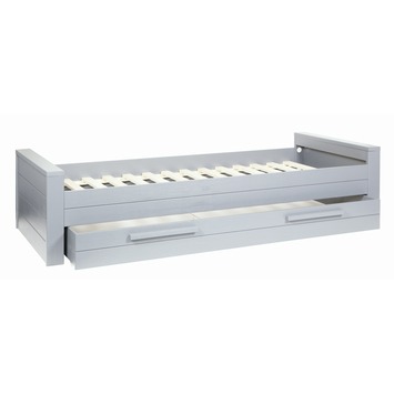 De lade is vervaardigd uit massief grenenhout en heeft een stevige MDF bodem. Het hout is gespoten in een betongrijze kleur en voorzien van een geborstelde afwerking, waardoor de houtnerf mooi zichtbaar blijft en het meubel een doorleefde uitstraling krijgt. Met de afmetingen van 21 cm hoog, 94 cm breed en 197 cm lang is de lade geschikt voor een matrasmaat van 90 x 190 cm (apart verkrijgbaar). Voeg een oprolbare lattenbodem toe om van de lade een volwaardig extra bed te maken.