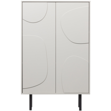 De WOOOD opbergkast Cadiz in mist grijs grenenhout is een praktische én opvallende kast die functionaliteit combineert met een uniek design. Deze stijlvolle kast straalt rust uit door de zachte mistkleur, terwijl de organisch gedecoreerde deuren een speels accent toevoegen. De strakke belijning en het contrast met de stevige zwarte poten geven het meubel een moderne en eigentijdse uitstraling.