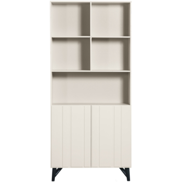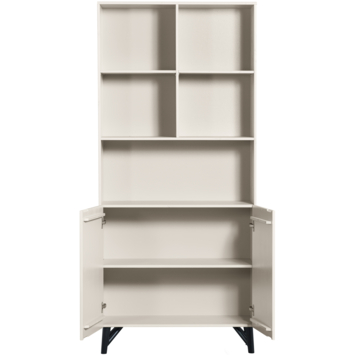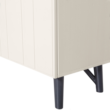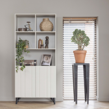 De kast is vervaardigd uit FSC-gecertificeerd grenenhout, zorgvuldig afgewerkt met een lak. De zichtbare houtstructuur geeft het meubel een natuurlijke uitstraling, terwijl het cleane ontwerp en de robuuste metalen poten het geheel een eigentijdse touch geven. Achter de twee deuren en in de open vakken biedt de kast verrassend veel opbergruimte voor alles wat je uit het zicht of juist in het zicht wilt plaatsen.
