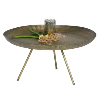 De WOOOD ronde bijzet/salontafel Layla (Øxh): 79x37 cm, met brass metalen tafelblad met gegraveerde decoratie en brass metalen poten, past in veel woonstijlen. Het fraaie gevormde tafelblad, gecombineerd met het brass metalen frame, geven dit meubel een unieke warme eigentijdse uitstraling. De bijzet/salontafel Layla is een sieraad in huis.