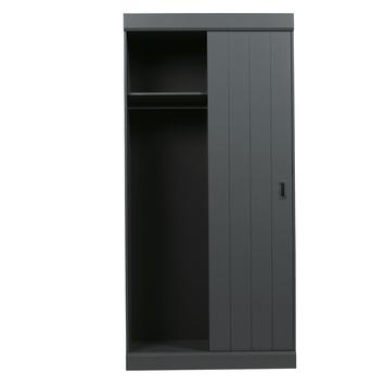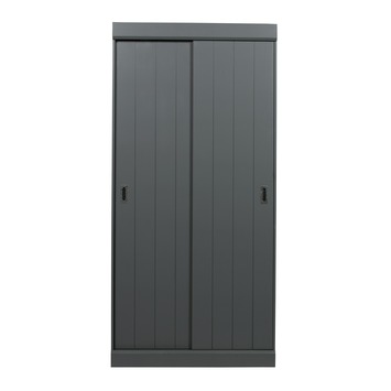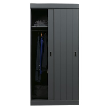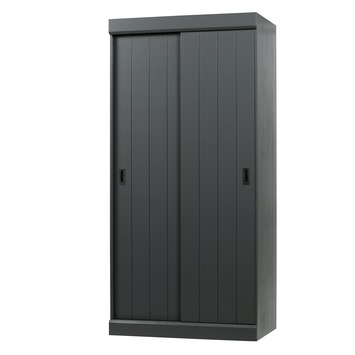 Stoer, stevig en een echte hit is deze WOOOD schuifdeurkast Hit (hxbxd) 205x98x60 cm. Deze massief FSC gecertificeerd Scandinavisch grenen hang- legkast heeft een geschuurde afwerking, is gespoten in de kleur staalgrijs en de schuifdeuren hebben een verticale v-groef belijning.