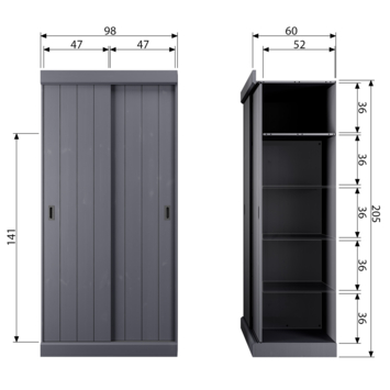 Deze stoere schuifdeurkast is een ideale garderobekast met verrassend veel opbergruimte en geschikt voor elk interieur. Het interieur van de kast bestaat standaard uit één brede legplank bovenin met daaronder een roede. Het bovenste vak is 36 cm hoog. De hoogte van het hanggedeelte is 148,5 cm. De tussenplank is spaanplaat, de achterkant van de Hit kast is HDF.