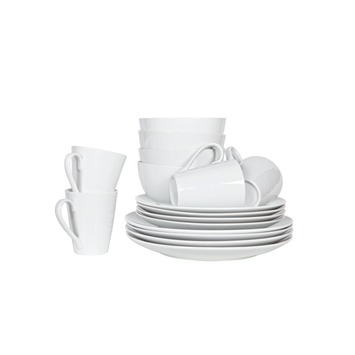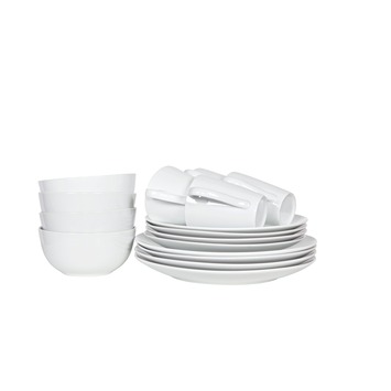 WOOOD servies Myrthe. Een 16 delig wit porselein servies in een strakke moderne vorm. Het servies Myrthe is voor 4-personen en bestaat uit 4 mokken, 4 ontijtborden, 4 dinerborden en 4 kommen. Het servies is vaatwasmachine bestendig.