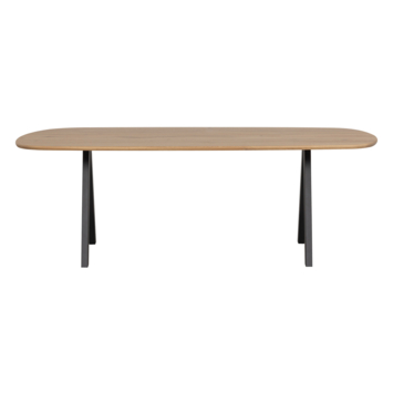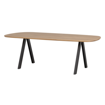 Afmetingen Het organisch gevormde tafelblad heeft een breedte van 220 cm en diepte van 100 cm, maar is dus niet rechthoekig te noemen. Het tafelblad heeft een dikte van 2,4 cm. De tafelpoot is vervaardigd uit 40x80x1 mm stalen buis en is afgewerkt met een mat zwarte poedercoat.