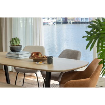 Eikenhout wordt gekenmerkt door de lichtbruine tint met een zachtgele gloed en duidelijk zichtbare nerftekening. Eikenhout droogt over het algemeen zeer langzaam, wat kan zorgen voor het natuurlijke proces van scheuring en verkleuring. Eikenhout is een natuurlijk product wat een zichtbaar podium verdient, hierom gebruiken wij enkel lakken en coatings op natuurlijk basis welke de nerftekeningen en natuurlijke eigenschappen van het eikenhout goed tot zijn recht laat komen. Het eikenhout van deze tafel is 100% FSC-gecertificeerd.