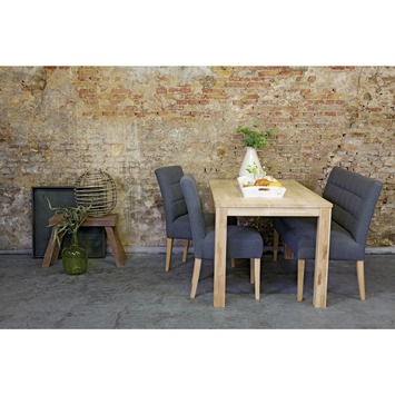 De WOOOD tafel Largo (lxbxh) 150x85x78 cm is een onbehandelde eiken tafel. De tafel is basic, robuust en geeft een warme uitstraling. Deze tafel Largo heeft vierkante stevige rechte blokpoten van 8x8 cm en een tafelblad dikte van 26 mm. Door toepassing van metalen hoekplaten aan de onderkant van het tafelblad is deze tafel zeer stabiel in gebruik. De hoogte van de tafel bedraagt 78 cm. De afstand tussen vloer en onderkant tafelregel bedraagt 68,5 cm (belangrijk bij armleunstoelen). Massief eiken brengt sfeer in huis, het onbehandelde eiken van deze tafel bestaat uit stroken verlijmd eikenhout (vingerlas). De eettafel Largo is ook leverbaar in de afmetingen: 230x90 cm, 200x90 cm, 180x85 cm en in het vierkant, 130x130 cm.