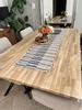 Het tafelblad is gemaakt van FSC-gecertificeerd massief eikenhout dat bestaat uit stroken verlijmd eikenhout met vingerlasverbindingen. Dit geeft het blad een levendig patroon en een warme uitstraling. Omdat het gaat om een natuurlijk product kunnen noesten, scheuren en oneffenheden zichtbaar zijn, wat het blad een uniek karakter geeft en elke tafel bijzonder maakt.