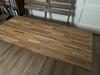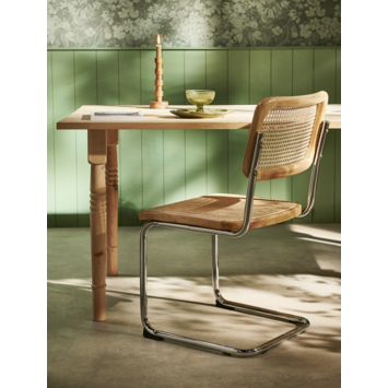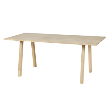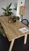 Het blad is gemaakt van FSC-gecertificeerd eikenhout en opgebouwd uit stroken verlijmd hout met vingerlasverbindingen. Het onbehandelde hout heeft een dikte van 2,4 centimeter en laat de natuurlijke nerven en noesten prachtig tot hun recht komen. Hierdoor krijgt iedere tafel zijn eigen unieke karakter.
