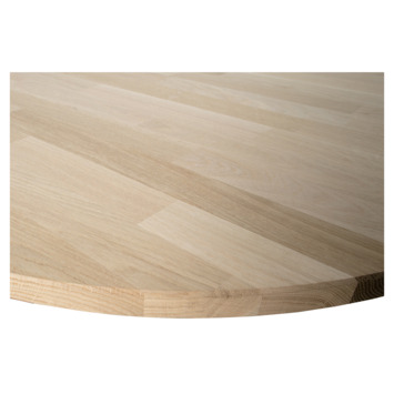Het tafelblad is gemaakt van FSC-gecertificeerd eikenhout en opgebouwd uit stroken verlijmd hout met vingerlasverbindingen. Het onbehandelde hout laat de natuurlijke nerven en noesten mooi zien en geeft elke tafel een eigen karakter. Dit maakt van het blad een unieke basis die warmte toevoegt aan je interieur.