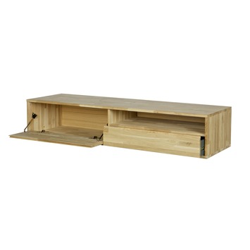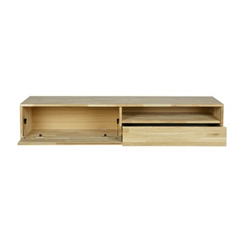 De WOOOD TV-audiomeubel Tygo 29x150x44 cm van onbehandeld eiken is een basic tv-audiomeubel. De vintage retro stijl brengt een speciale eigentijdse jaren zestig sfeer in huis. Bovenin zit één royaal vak voor audioapparatuur of een aantal mooie boeken. Aan de linkerzijde een vak dat afgesloten wordt door een klep en onder het open vak aan de rechterzijde een lade met solide metalen ladegeleiders. Een TV-audio meubel die heel veelzijdig is. De afmetingen van het meubel zijn: (bxhxd) 150x29x43 cm. Het onbehandelde eiken van dit meubel bestaat uit stroken verlijmd eikenhout (vingerlas).