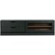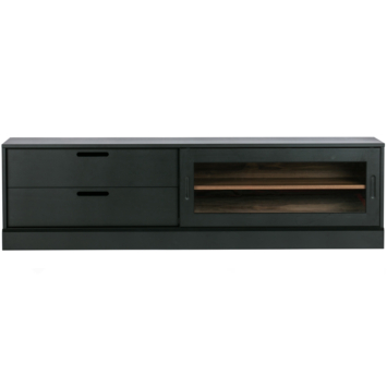 De indeling van het tv-meubel is praktisch en doordacht. Twee ruime lades van 83 cm breed en 13 cm hoog bieden volop opbergruimte voor kabels, afstandsbedieningen of accessoires. Daarnaast beschikt het meubel over twee open vakken van elk 87 cm breed en 18 cm hoog — ideaal voor media-apparatuur. De schuifdeur van glas biedt de mogelijkheid om apparatuur uit het zicht te houden, zonder in te leveren op gebruiksgemak.