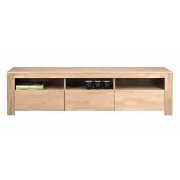De massief eiken TV-audiomeubel Lars is basic, robuust en geeft een warme uitstraling. Dit TV-audiomeubel uit de WOOOD collectie is tijdloos en past in iedere woonstijl. Bovenin het meubel zitten 3 vakken voor bijvoorbeeld een audio- installatie of tijdschriften en de drie ruime greeploze lades onderin bieden plek voor bv DVD’s, CD’s. De lades zijn voorzien van solide metalen ladegeleiders. De afmetingen van het meubel zijn: (bxhxd): 172x47x45 cm. Het onbehandelde eiken van dit meubel zijn stroken verlijmd eikenhout (vingerlas). Ter bescherming van het meubel adviseert KARWEI dit eiken meubel te behandelen met meubelolie of lak. Dit TV-audiomeubel Lars is ook verkrijgbaar in grenen, wit gelakt en in de breedtes 120 cm en 150 cm. Dit meubel wordt als bouwpakket geleverd en is makkelijk te monteren met behulp van de bijgeleverde montage instructie.