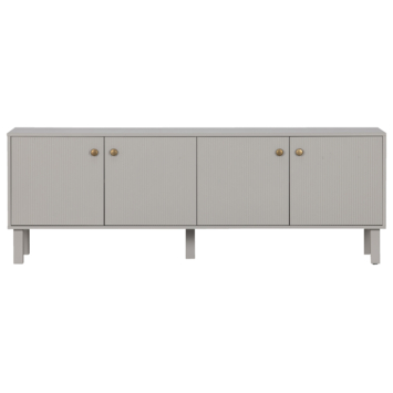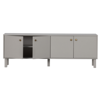 Het WOOOD TV-meubel Madu in wolkengrijs grenenhout is een moderne en elegante toevoeging aan je interieur. Dit stijlvolle meubelstuk is vervaardigd uit FSC-gecertificeerd grenenhout en afgewerkt met een wolkengrijze lak die de natuurlijke houtstructuur subtiel zichtbaar laat. De goudkleurige knoppen geven een chique contrast en zorgen samen met de strakke lijnen voor een eigentijds karakter.
