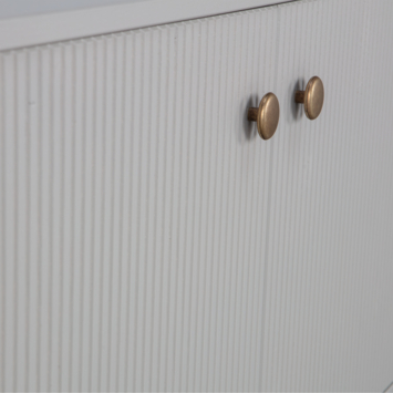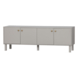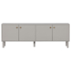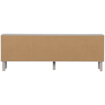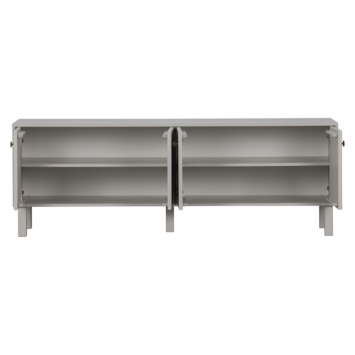 Met afmetingen van 56 x 160 x 46 cm biedt dit tv-meubel voldoende ruimte om je televisie en bijbehorende apparatuur te plaatsen. Achter de vier deuren met goudkleurige knopjes bevinden zich vier legplanken, ideaal voor het opbergen van media-accessoires, boeken of andere benodigdheden. De indeling zorgt ervoor dat alles netjes en overzichtelijk opgeborgen blijft, terwijl het bovenblad ruimte biedt voor decoratieve items naast de tv.