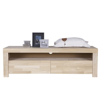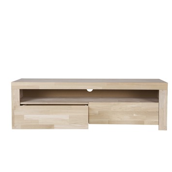 De WOOOD TV-audiomeubel Mats 46x150x44 cm is basic, onbehandeld, robuust en geeft een warme uitstraling. Bovenin zit één royaal vak voor audioapparatuur of een aantal mooie boeken. De twee ruime greeploze lades onderin bieden plek voor bijvoorbeeld DVD’s, CD’s en game accessoires. De lades zijn voorzien van solide metalen ladegeleiders. Het onbehandelde eiken van dit meubel bestaat uit stroken verlijmd eikenhout (vingerlas).