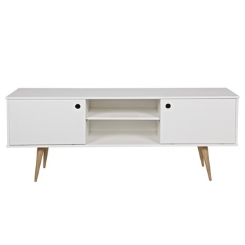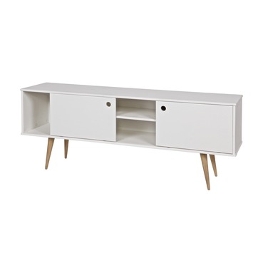 De WOOOD TV-meubel Retro 60x150x38 cm is een Limited Edition en heeft een moderne eigentijdse uitstraling. De meubel komt uit de vintage collectie 1975 van KARWEI. Het TV-meubel is gemaakt van wit gelakt FSC grenen en staat op onbehandeld FSC blank eiken houten poten. Het TV-meubel heeft 2 schuifdeuren waarin bijv. audioapparatuur kan worden geplaatst. De afmetingen van het meubel zijn: (bxhxd) 150x60x38 cm. Als bijpassend meubel is er een WOOOD retro bijzettafel verkrijgbaar dat voorzien is van 2 laden.
