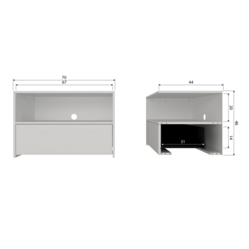 Het meubel is voorzien van één handige lade waarin je gemakkelijk kleine accessoires zoals kabels of afstandsbedieningen kunt opbergen. Met compacte afmetingen van 46 x 70 x 44 cm neemt Yissa weinig ruimte in beslag, terwijl het bovenblad plaats biedt voor een televisie of decoratieve items. De natuurlijke nerftekeningen van het grenenhout maken elk meubel uniek en geven een warme, sfeervolle uitstraling.