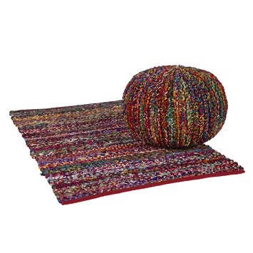Dit vloerkleed van 140x80cm is geknoopt van gerecycled 100% katoen. En door de hoeveelheid aan verschillende kleuren krijg je een vrolijk kleed die goed past bij verschillende woonstylen. Van hetzelfde materiaal is ook een geknoopte poef verkrijgbaar. Dit vloerkleed en deze poef kan perfect gecombineerd worden met het wit gelakte grenen bed Joy.