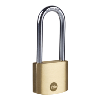 Yale 40 mm messing hangslot met verchroomd stalen lange beugel voor algemeen gebruik. Sluiten door dicht te klikken en te openen met sleutel, gelijksluitend. Met dubbele vergrendeling voor extra veiligheid. Inclusief 3 sleutels.